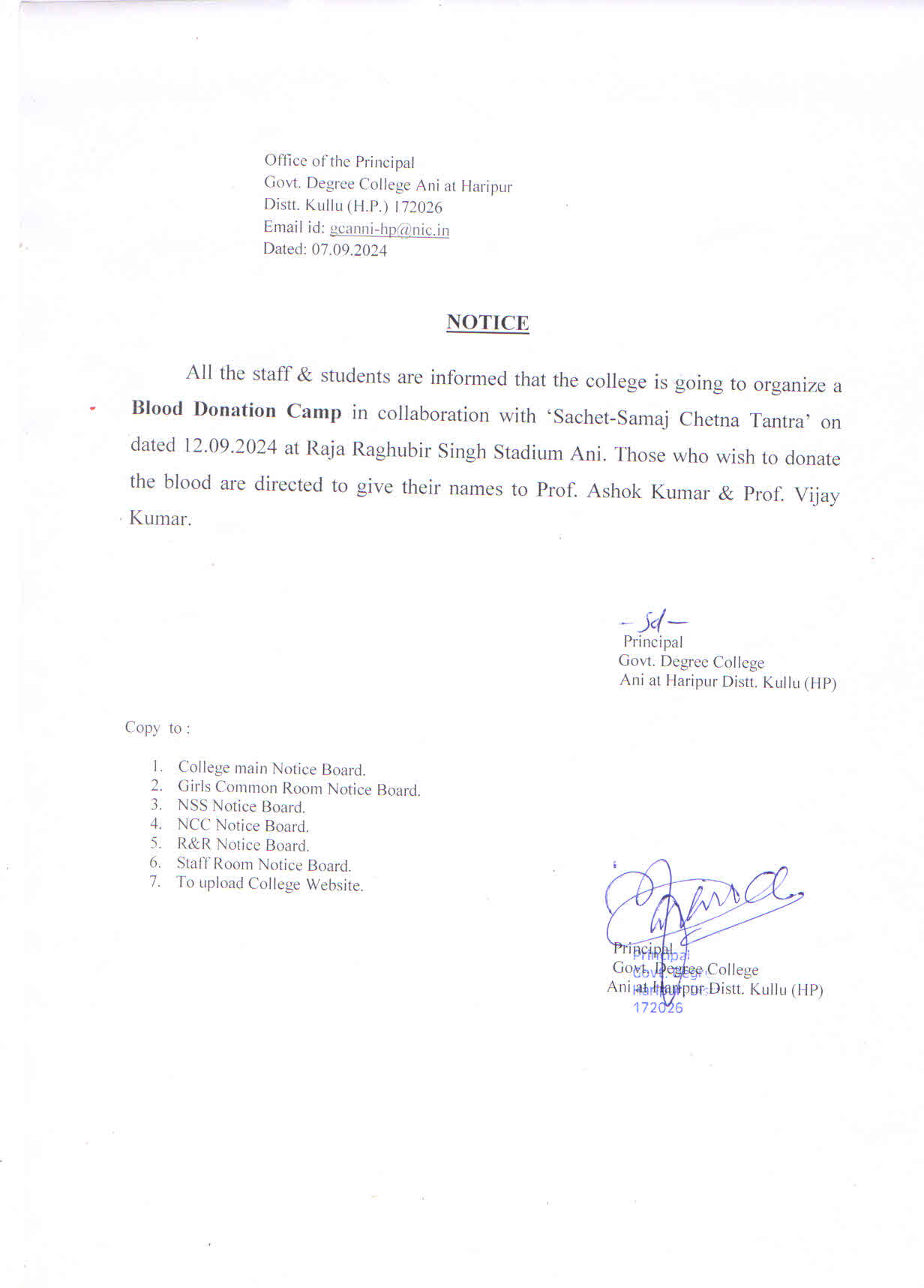 Notice regarding Blood Donation Camp