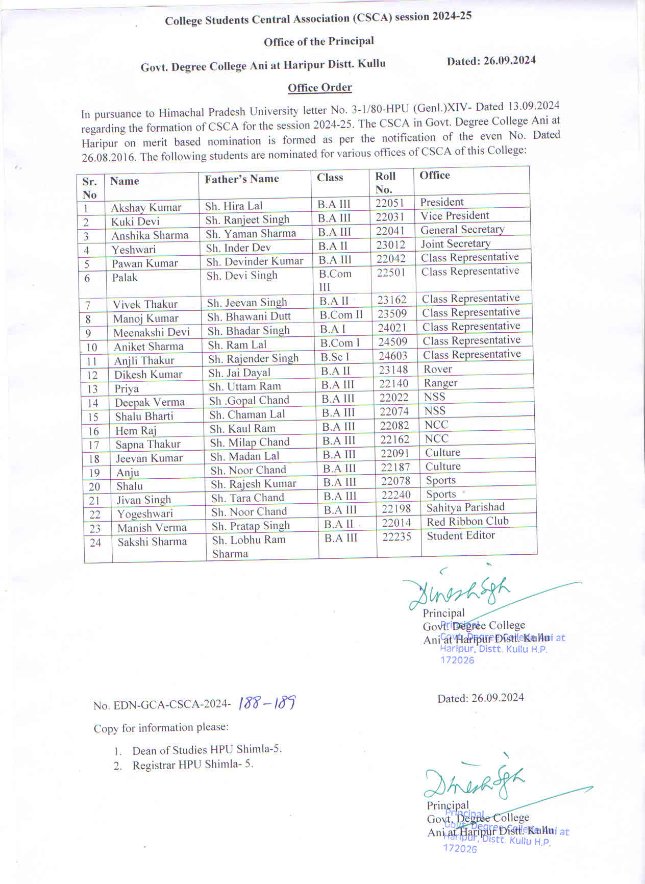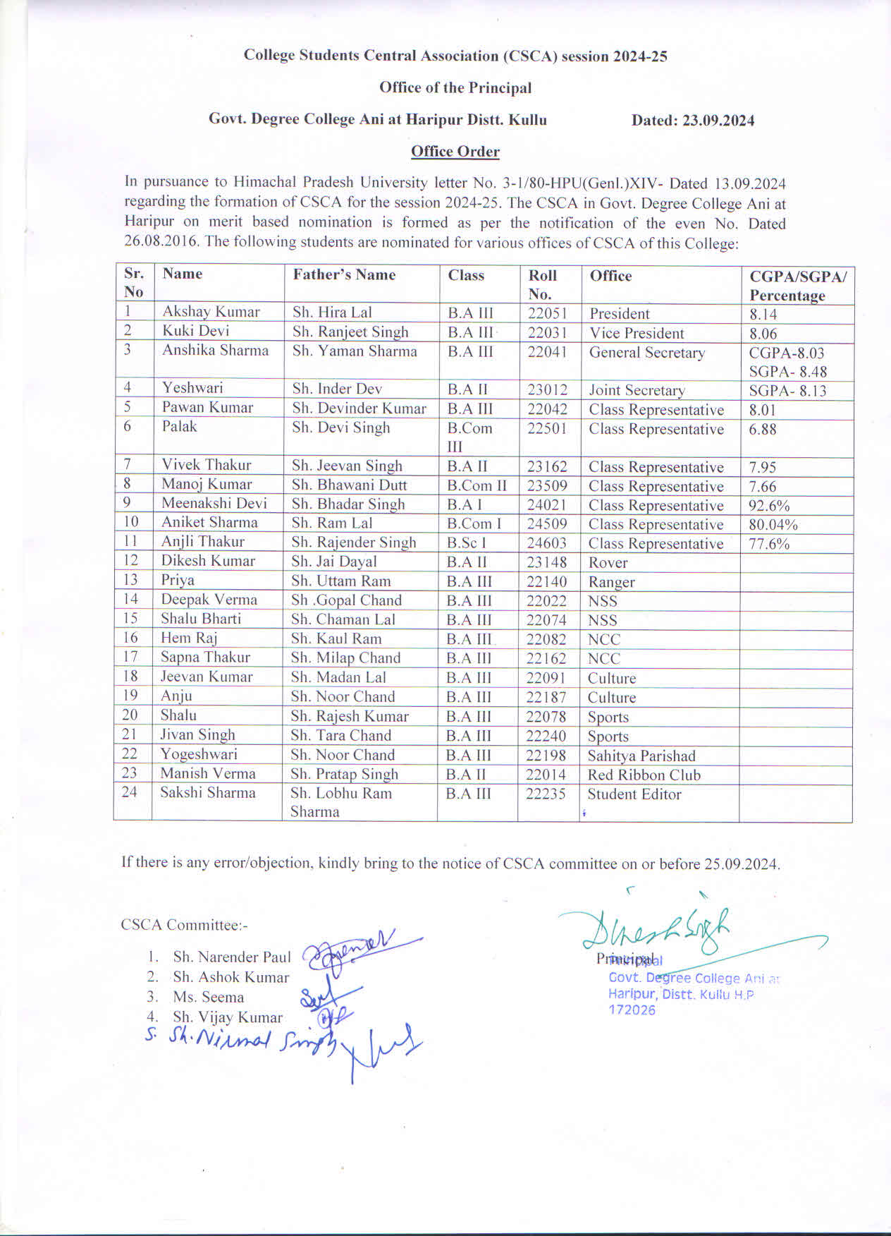 CSCA body for session 2024-25