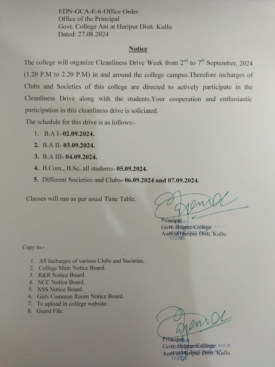 Cleanliness Drive will be organized in and around the college campus w.e.f. 02.09.2024