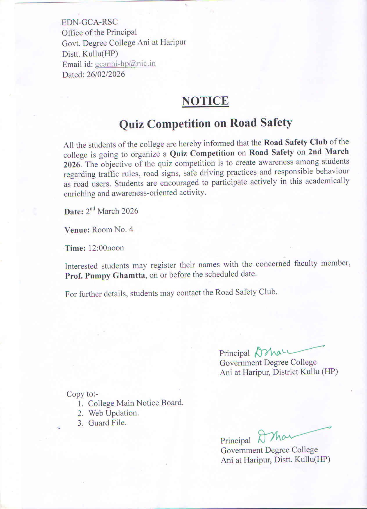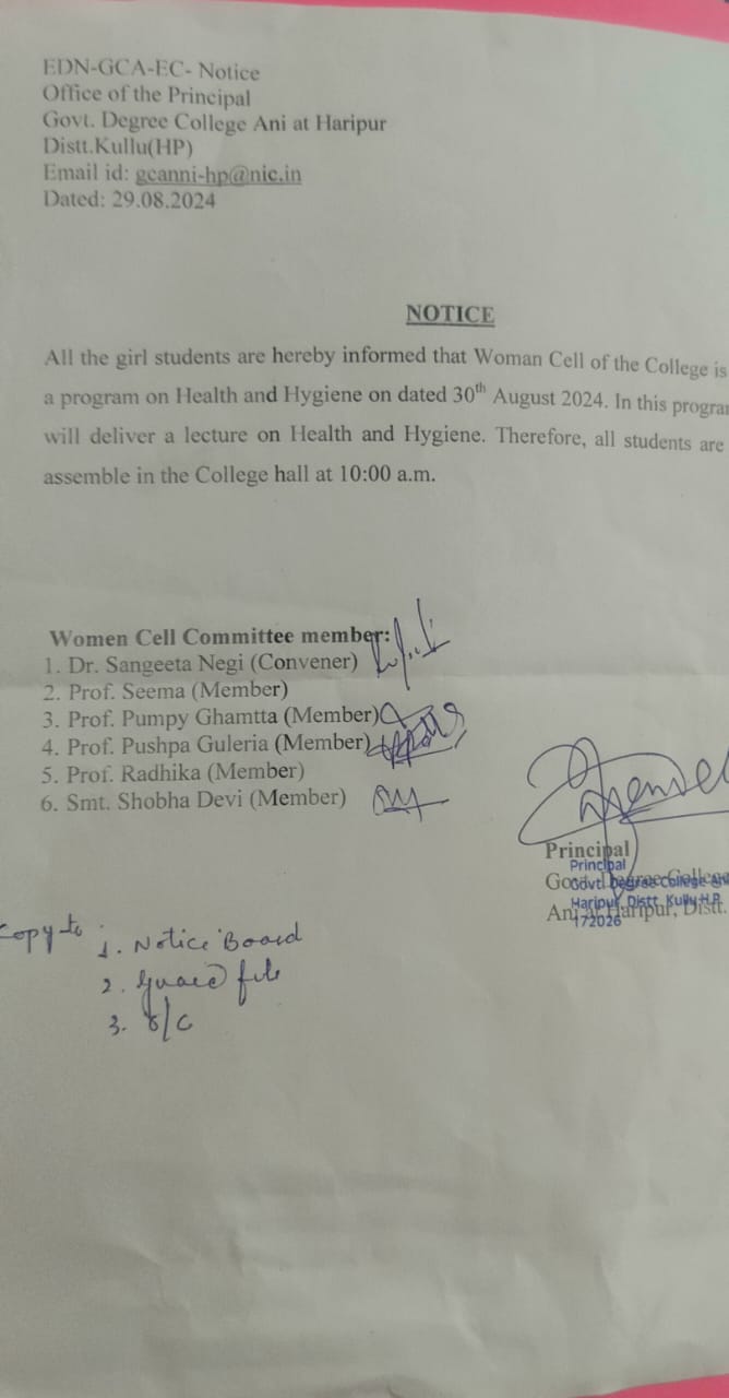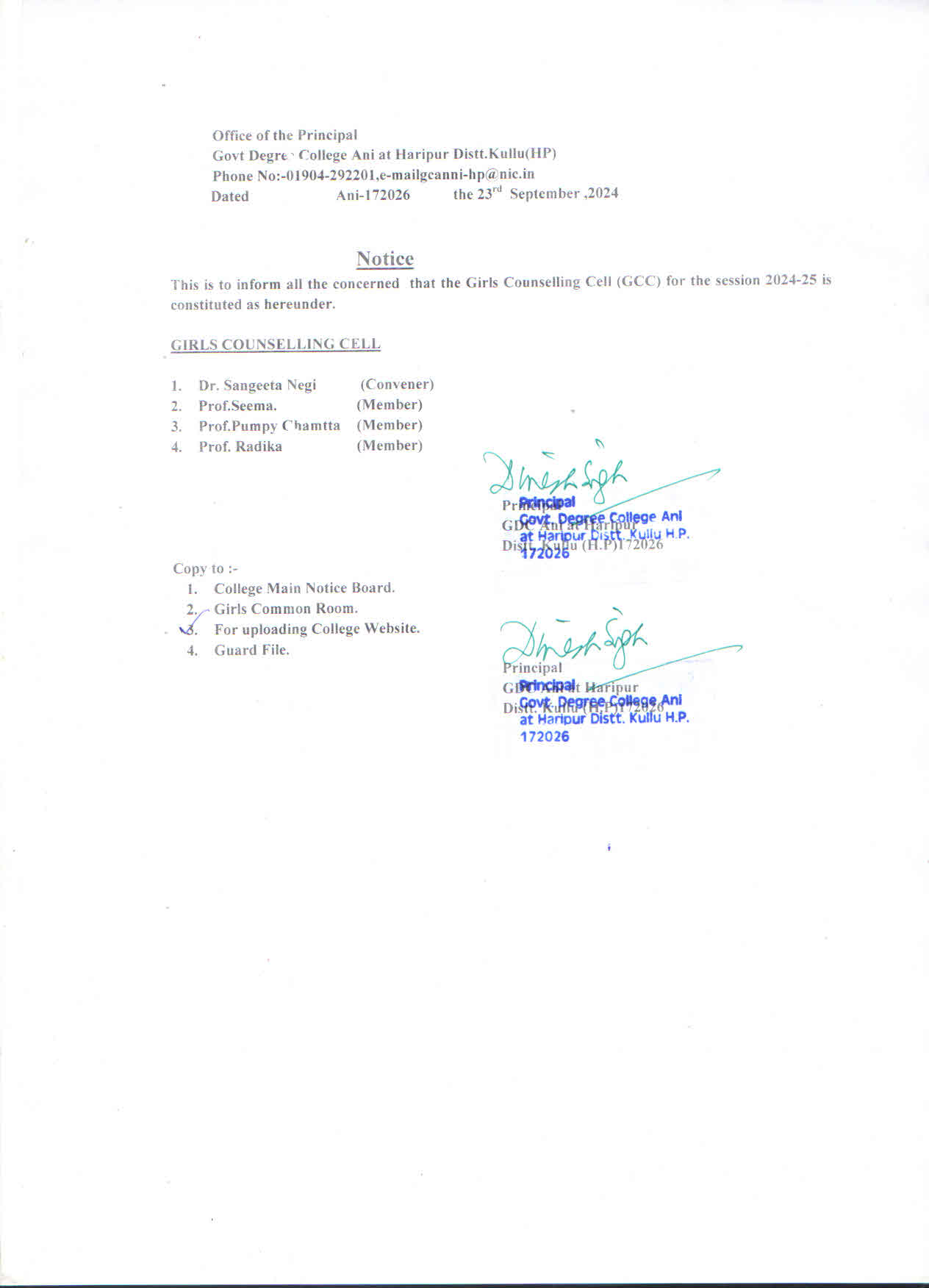 Notice regarding constitution of Girls Counselling Cell